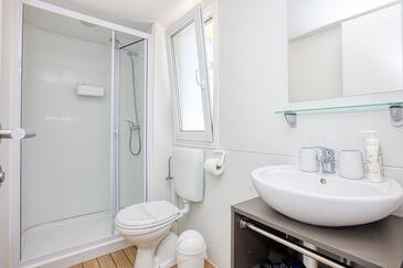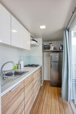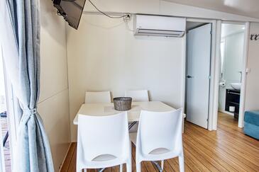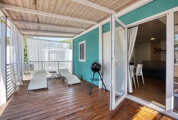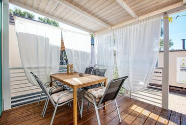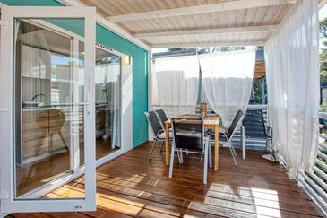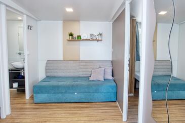 Ferienwohnung bietet Platz für 6 Gäste. Die Betten sind in Schlafzimmern, die es 2 gibt, und in Wohnzimmer, innerhalb einer Gesamtfläche von 30m2, angeordnet. Die Gäste haben eine eigene Terrasse zur Verfügung, auf der sie in warmen Sommernächten genießen können. Es ist erlaubt, Speisen auf dem Gemeinschafts-Grill vorzubereiten.