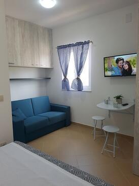 Studio bietet Platz für 3 Gäste. Die Betten sind in Schlafzimmern, die es 1 gibt, und in Wohnzimmer, innerhalb einer Gesamtfläche von 20m2, angeordnet. Die Gäste haben eine eigene Terrasse zur Verfügung, auf der sie in warmen Sommernächten genießen können. Das Studio-Apartment bietet Meerblick. Es ist erlaubt, Speisen auf dem Gemeinschafts-Grill vorzubereiten. In der Unterkunftseinheit besteht die Möglichkeit des Mitbringens von Haustieren gegen Aufpreis.