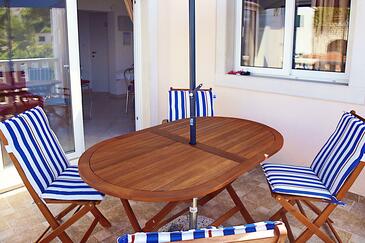 Ferienwohnung bietet Platz für 2 Gäste. Die Betten sind in Schlafzimmern, die es 1 gibt, innerhalb einer Gesamtfläche von 30m2, angeordnet. Die Gäste haben eine eigene Terrasse zur Verfügung, auf der sie in warmen Sommernächten genießen können. Das Apartment bietet Meerblick. Es ist erlaubt, Speisen auf dem Gemeinschafts-Grill vorzubereiten.