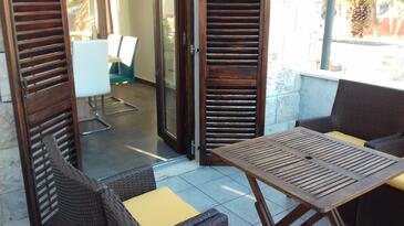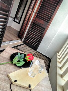 Ferienwohnung bietet Platz für 4 Gäste. Die Betten sind in Schlafzimmern, die es 2 gibt, innerhalb einer Gesamtfläche von 60m2, angeordnet. Die Gäste haben eine eigene Terrasse zur Verfügung, auf der sie in warmen Sommernächten genießen können. Es ist erlaubt, Speisen auf dem Gemeinschafts-Grill vorzubereiten.
