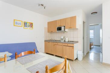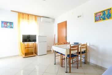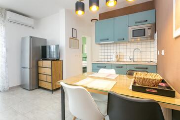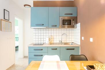 Ferienwohnung bietet Platz für 4 Gäste. Die Betten sind in Schlafzimmern, die es 1 gibt, und in Wohnzimmer, innerhalb einer Gesamtfläche von 33m2, angeordnet. Die Gäste haben eine eigene Terrasse zur Verfügung, auf der sie in warmen Sommernächten genießen können. Das Apartment bietet Meerblick. Es ist erlaubt, Speisen auf dem Gemeinschafts-Grill vorzubereiten.