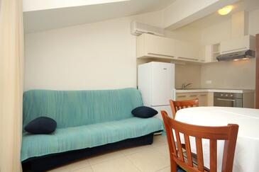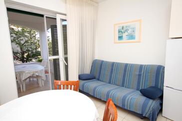 Ferienwohnung bietet Platz für 4 Gäste. Die Betten sind in Schlafzimmern, die es 2 gibt, innerhalb einer Gesamtfläche von 43m2, angeordnet. Die Gäste haben eine eigene Terrasse zur Verfügung, auf der sie in warmen Sommernächten genießen können. Das Apartment bietet Meerblick. Es ist erlaubt, Speisen auf dem Gemeinschafts-Grill vorzubereiten. In der Unterkunftseinheit besteht die Möglichkeit des Mitbringens von Haustieren gegen Aufpreis.