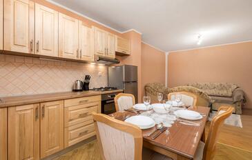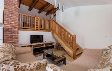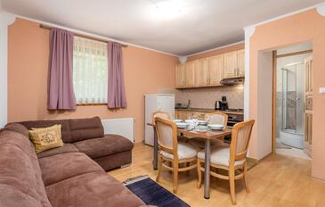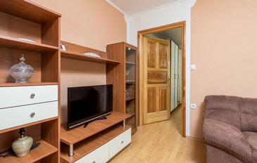 Ferienwohnung bietet Platz für 6 Gäste. Die Betten sind in Schlafzimmern, die es 2 gibt, und in Wohnzimmer, innerhalb einer Gesamtfläche von 46m2, angeordnet. Die Gäste haben eine eigene Terrasse zur Verfügung, auf der sie in warmen Sommernächten genießen können. Es ist erlaubt, Speisen auf dem Gemeinschafts-Grill vorzubereiten.
