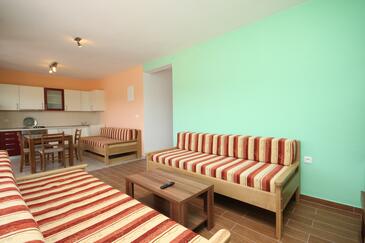 Ferienwohnung bietet Platz für 6 Gäste. Die Betten sind in Schlafzimmern, die es 2 gibt, und in Wohnzimmer, innerhalb einer Gesamtfläche von 59m2, angeordnet. Die Gäste haben eine eigene Terrasse zur Verfügung, auf der sie in warmen Sommernächten genießen können. Das Apartment bietet Meerblick. Es ist erlaubt, Speisen auf dem Gemeinschafts-Grill vorzubereiten. In der Unterkunftseinheit besteht die Möglichkeit des Mitbringens von Haustieren gegen Aufpreis.