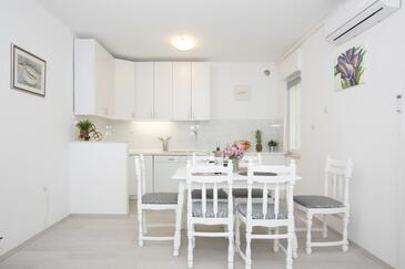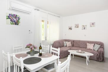 Ferienwohnung bietet Platz für 6 Gäste. Die Betten sind in Schlafzimmern, die es 2 gibt, und in Wohnzimmer, innerhalb einer Gesamtfläche von 58m2, angeordnet. Die Gäste haben eine eigene Terrasse zur Verfügung, auf der sie in warmen Sommernächten genießen können. Es ist erlaubt, Speisen auf dem Gemeinschafts-Grill vorzubereiten.