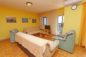 Ferienwohnung bietet Platz für 6 Gäste. Die Betten sind in Schlafzimmern, die es 3 gibt, innerhalb einer Gesamtfläche von 72m2, angeordnet. Die Gäste haben eine eigene Terrasse zur Verfügung, auf der sie in warmen Sommernächten genießen können. Das Apartment bietet Meerblick. Es ist erlaubt, Speisen auf dem Gemeinschafts-Grill vorzubereiten. In der Unterkunftseinheit besteht die Möglichkeit des Mitbringens von Haustieren gegen Aufpreis.