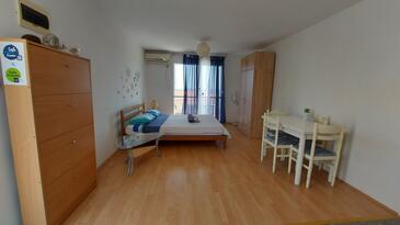 Haus bietet Platz für 8 Gäste. Die Betten sind in Schlafzimmern, die es 3 gibt, und in Wohnzimmer, innerhalb einer Gesamtfläche von 100m2, angeordnet. Die Gäste haben einen eigenen Balkon zur Verfügung, auf der sie in warmen Sommernächten genießen können. Das Haus bietet Meerblick. Es ist erlaubt, Speisen auf dem Gemeinschafts-Grill vorzubereiten.