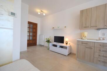 Ferienwohnung bietet Platz für 5 Gäste. Die Betten sind in Schlafzimmern, die es 2 gibt, und in Wohnzimmer, innerhalb einer Gesamtfläche von 45m2, angeordnet. Die Gäste haben eine eigene Terrasse zur Verfügung, auf der sie in warmen Sommernächten genießen können. Es ist erlaubt, Speisen auf dem Gemeinschafts-Grill vorzubereiten.
