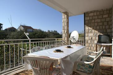 Ferienwohnung bietet Platz für 8 Gäste. Die Betten sind in Schlafzimmern, die es 2 gibt, und in Esszimmer, innerhalb einer Gesamtfläche von 52m2, angeordnet. Die Gäste haben eine eigene Terrasse zur Verfügung, auf der sie in warmen Sommernächten genießen können. Es ist erlaubt, Speisen auf dem Gemeinschafts-Grill vorzubereiten. In der Unterkunftseinheit besteht die Möglichkeit des Mitbringens von Haustieren gegen Aufpreis.