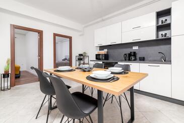 Ferienwohnung bietet Platz für 4 Gäste. Die Betten sind in Schlafzimmern, die es 2 gibt, innerhalb einer Gesamtfläche von 61m2, angeordnet. Die Gäste haben eine eigene Terrasse zur Verfügung, auf der sie in warmen Sommernächten genießen können. Es ist erlaubt, Speisen auf dem Gemeinschafts-Grill vorzubereiten.