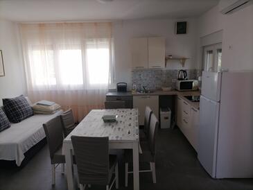 Ferienwohnung bietet Platz für 6 Gäste. Die Betten sind in Schlafzimmern, die es 2 gibt, und in Wohnzimmer, innerhalb einer Gesamtfläche von 60m2, angeordnet. Die Gäste haben eine eigene Terrasse zur Verfügung, auf der sie in warmen Sommernächten genießen können. Es ist erlaubt, Speisen auf dem Gemeinschafts-Grill vorzubereiten.