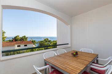 Ferienwohnung bietet Platz für 6 Gäste. Die Betten sind in Schlafzimmern, die es 2 gibt, und in Wohnzimmer, innerhalb einer Gesamtfläche von 56m2, angeordnet. Die Gäste haben eine eigene Terrasse zur Verfügung, auf der sie in warmen Sommernächten genießen können. Das Apartment bietet Meerblick. Es ist erlaubt, Speisen auf dem Gemeinschafts-Grill vorzubereiten.