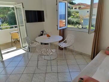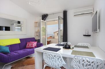 Ferienwohnung bietet Platz für 4 Gäste. Die Betten sind in Schlafzimmern, die es 1 gibt, und in Wohnzimmer, innerhalb einer Gesamtfläche von 31m2, angeordnet. Die Gäste haben eine eigene Terrasse zur Verfügung, auf der sie in warmen Sommernächten genießen können. Das Apartment bietet Meerblick. Es ist erlaubt, Speisen auf dem Gemeinschafts-Grill vorzubereiten.