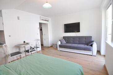 Studio bietet Platz für 2 Gäste. Die Betten sind in Schlafzimmern, die es 1 gibt, innerhalb einer Gesamtfläche von 26m2, angeordnet. Die Gäste haben einen eigenen Balkon zur Verfügung, auf der sie in warmen Sommernächten genießen können. Das Studio-Apartment bietet Meerblick.