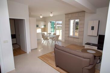 Ferienwohnung bietet Platz für 6 Gäste. Die Betten sind in Schlafzimmern, die es 2 gibt, und in Wohnzimmer, innerhalb einer Gesamtfläche von 80m2, angeordnet. Die Gäste haben eine eigene Terrasse zur Verfügung, auf der sie in warmen Sommernächten genießen können. Das Apartment bietet Meerblick. Es ist erlaubt, Speisen auf dem Gemeinschafts-Grill vorzubereiten. Während ihres Aufenthalts können Gäste das gemeinsam zur Nutzung stehende Schwimmbad benutzen.