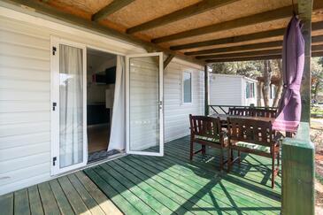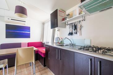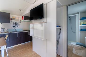 Ferienwohnung bietet Platz für 6 Gäste. Die Betten sind in Schlafzimmern, die es 2 gibt, und in Esszimmer, innerhalb einer Gesamtfläche von 32m2, angeordnet. Die Gäste haben eine eigene Terrasse zur Verfügung, auf der sie in warmen Sommernächten genießen können. Es ist erlaubt, Speisen auf dem Gemeinschafts-Grill vorzubereiten. In der Unterkunftseinheit besteht die Möglichkeit des Mitbringens von Haustieren gegen Aufpreis.