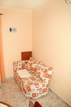Ferienwohnung bietet Platz für 5 Gäste. Die Betten sind in Schlafzimmern, die es 2 gibt, innerhalb einer Gesamtfläche von 47m2, angeordnet. Die Gäste haben eine eigene Terrasse zur Verfügung, auf der sie in warmen Sommernächten genießen können. Das Apartment bietet Meerblick. Es ist erlaubt, Speisen auf dem Gemeinschafts-Grill vorzubereiten.