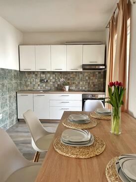 Ferienwohnung bietet Platz für 6 Gäste. Die Betten sind in Schlafzimmern, die es 2 gibt, und in Wohnzimmer, innerhalb einer Gesamtfläche von 62m2, angeordnet. Die Gäste haben eine eigene Terrasse zur Verfügung, auf der sie in warmen Sommernächten genießen können. Es ist erlaubt, Speisen auf dem Gemeinschafts-Grill vorzubereiten.