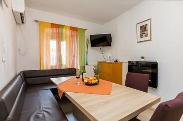 Haus bietet Platz für 8 Gäste. Die Betten sind in Schlafzimmern, die es 4 gibt, innerhalb einer Gesamtfläche von 129m2, angeordnet. Die Gäste haben eine eigene Terrasse zur Verfügung, auf der sie in warmen Sommernächten genießen können. Es ist erlaubt, Speisen auf dem Gemeinschafts-Grill vorzubereiten.