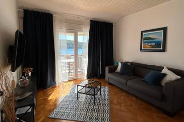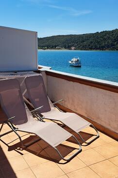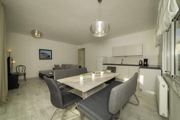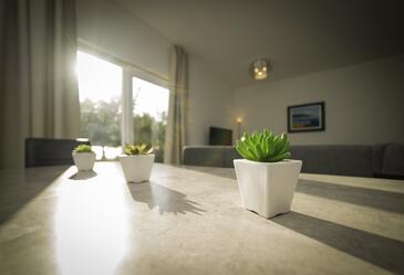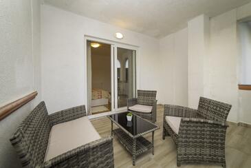 Ferienwohnung bietet Platz für 4 Gäste. Die Betten sind in Schlafzimmern, die es 2 gibt, innerhalb einer Gesamtfläche von 90m2, angeordnet. Die Gäste haben eine eigene Terrasse zur Verfügung, auf der sie in warmen Sommernächten genießen können. Das Apartment bietet Meerblick. Es ist erlaubt, Speisen auf dem Gemeinschafts-Grill vorzubereiten.