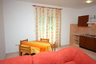Ferienwohnung bietet Platz für 5 Gäste. Die Betten sind in Schlafzimmern, die es 2 gibt, innerhalb einer Gesamtfläche von 71m2, angeordnet. Die Gäste haben eine eigene Terrasse zur Verfügung, auf der sie in warmen Sommernächten genießen können. Es ist erlaubt, Speisen auf dem Gemeinschafts-Grill vorzubereiten.