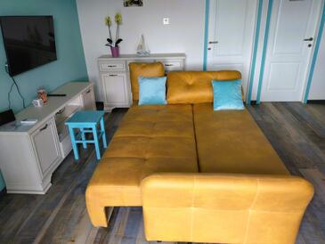 Ferienwohnung bietet Platz für 3 Gäste. Die Betten sind in Schlafzimmern, die es 1 gibt, und in Wohnzimmer, innerhalb einer Gesamtfläche von 48m2, angeordnet. Die Gäste haben eine eigene Terrasse zur Verfügung, auf der sie in warmen Sommernächten genießen können. Es ist erlaubt, Speisen auf dem Gemeinschafts-Grill vorzubereiten. Durch die Terrasse der gebuchten Unterkunftseinheit gehen auch andere Gäste oder Vermieter.
