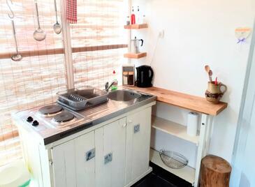 Studio bietet Platz für 2 Gäste. Die Betten sind in Wohnzimmer, innerhalb einer Gesamtfläche von 35m2, angeordnet. Die Gäste haben einen eigenen Balkon zur Verfügung, auf der sie in warmen Sommernächten genießen können. Das Studio-Apartment bietet Meerblick. Es ist erlaubt, Speisen auf dem Gemeinschafts-Grill vorzubereiten.