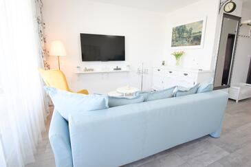 Ferienwohnung bietet Platz für 4 Gäste. Die Betten sind in Schlafzimmern, die es 1 gibt, und in Wohnzimmer, innerhalb einer Gesamtfläche von 52m2, angeordnet. Die Gäste haben eine eigene Terrasse zur Verfügung, auf der sie in warmen Sommernächten genießen können. Das Apartment bietet Meerblick. Es ist erlaubt, Speisen auf dem Gemeinschafts-Grill vorzubereiten.