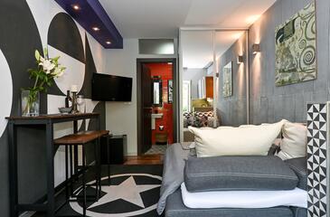 Studio bietet Platz für 2 Gäste. Die Betten sind in Schlafzimmern, die es 1 gibt, innerhalb einer Gesamtfläche von 22m2, angeordnet. Die Gäste haben einen eigenen Balkon zur Verfügung, auf der sie in warmen Sommernächten genießen können.