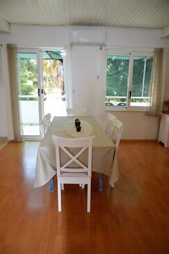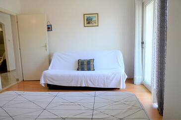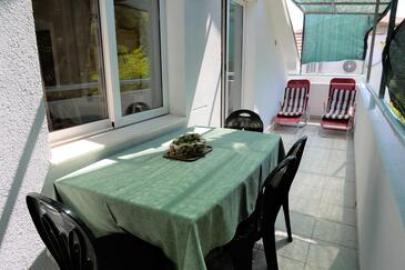 Ferienwohnung bietet Platz für 6 Gäste. Die Betten sind in Schlafzimmern, die es 2 gibt, innerhalb einer Gesamtfläche von 70m2, angeordnet. Die Gäste haben eine eigene Terrasse zur Verfügung, auf der sie in warmen Sommernächten genießen können. Das Apartment bietet Meerblick. Es ist erlaubt, Speisen auf dem Gemeinschafts-Grill vorzubereiten.