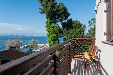 Ferienwohnung bietet Platz für 5 Gäste. Die Betten sind in Schlafzimmern, die es 3 gibt, innerhalb einer Gesamtfläche von 60m2, angeordnet. Die Gäste haben eine eigene Terrasse zur Verfügung, auf der sie in warmen Sommernächten genießen können. Das Apartment bietet Meerblick. Es ist erlaubt, Speisen auf dem Gemeinschafts-Grill vorzubereiten.