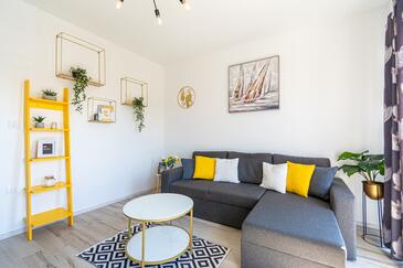 Ferienwohnung bietet Platz für 5 Gäste. Die Betten sind in Schlafzimmern, die es 2 gibt, und in Wohnzimmer, innerhalb einer Gesamtfläche von 49m2, angeordnet. Die Gäste haben eine eigene Terrasse zur Verfügung, auf der sie in warmen Sommernächten genießen können. Es ist erlaubt, Speisen auf dem Gemeinschafts-Grill vorzubereiten.