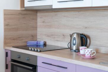 Ferienwohnung bietet Platz für 8 Gäste. Die Betten sind in Schlafzimmern, die es 4 gibt, innerhalb einer Gesamtfläche von 108m2, angeordnet. Die Gäste haben eine eigene Terrasse zur Verfügung, auf der sie in warmen Sommernächten genießen können. Es ist erlaubt, Speisen auf dem Gemeinschafts-Grill vorzubereiten.