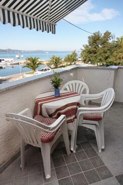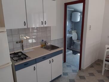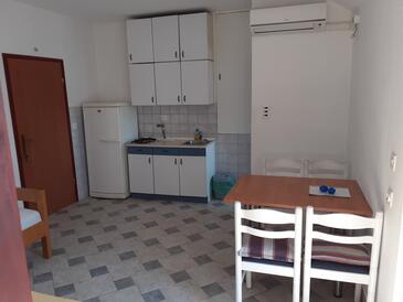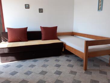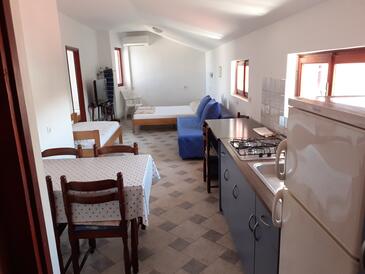 Studio bietet Platz für 5 Gäste. Die Betten sind in Schlafzimmern, die es 1 gibt, und in Wohnzimmer, innerhalb einer Gesamtfläche von 38m2, angeordnet. Die Gäste haben eine eigene Terrasse zur Verfügung, auf der sie in warmen Sommernächten genießen können. Das Studio-Apartment bietet Meerblick. Es ist erlaubt, Speisen auf dem Gemeinschafts-Grill vorzubereiten.