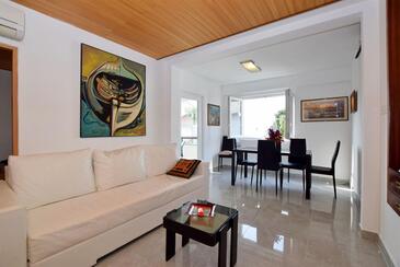 Ferienwohnung bietet Platz für 5 Gäste. Die Betten sind in Schlafzimmern, die es 2 gibt, und in Wohnzimmer, innerhalb einer Gesamtfläche von 60m2, angeordnet. Die Gäste haben eine eigene Terrasse zur Verfügung, auf der sie in warmen Sommernächten genießen können. Das Apartment bietet Meerblick. Es ist erlaubt, Speisen auf dem Gemeinschafts-Grill vorzubereiten.