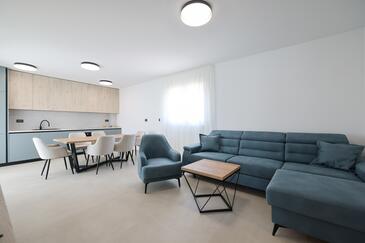 Ferienwohnung bietet Platz für 7 Gäste. Die Betten sind in Schlafzimmern, die es 3 gibt, und in Wohnzimmer, innerhalb einer Gesamtfläche von 77m2, angeordnet. Die Gäste haben eine eigene Terrasse zur Verfügung, auf der sie in warmen Sommernächten genießen können. Das Apartment bietet Meerblick. Es ist erlaubt, Speisen auf dem Gemeinschafts-Grill vorzubereiten.
