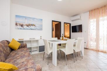 Ferienwohnung bietet Platz für 6 Gäste. Die Betten sind in Schlafzimmern, die es 2 gibt, und in Wohnzimmer, innerhalb einer Gesamtfläche von 53m2, angeordnet. Die Gäste haben eine eigene Terrasse zur Verfügung, auf der sie in warmen Sommernächten genießen können. Es ist erlaubt, Speisen auf dem Gemeinschafts-Grill vorzubereiten.