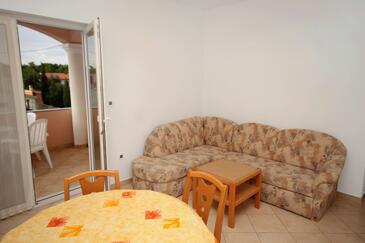 Ferienwohnung bietet Platz für 5 Gäste. Die Betten sind in Schlafzimmern, die es 2 gibt, und in Wohnzimmer, innerhalb einer Gesamtfläche von 45m2, angeordnet. Die Gäste haben eine eigene Terrasse zur Verfügung, auf der sie in warmen Sommernächten genießen können. Das Apartment bietet Meerblick. Es ist erlaubt, Speisen auf dem Gemeinschafts-Grill vorzubereiten.